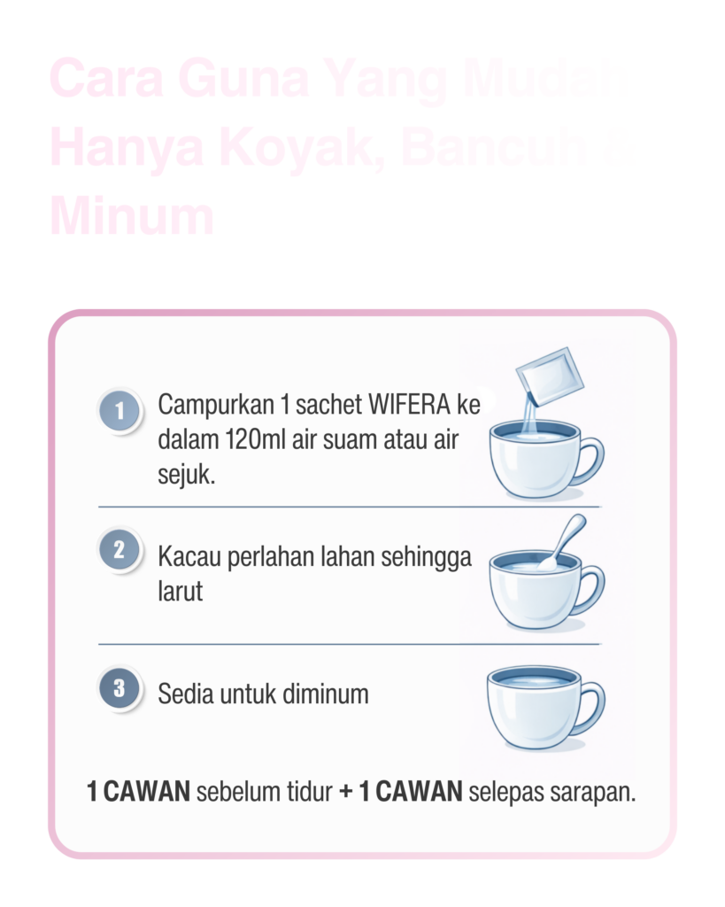 1 sachet WIFERA dibancuh dengan ±120ml air suam atau air sejuk.